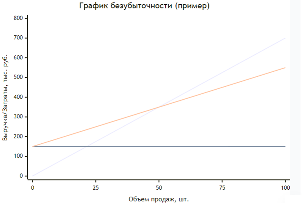 Этот график демонстрирует, что при продаже 50 единиц (и выручке 350 тыс. руб.) линии выручки и общих затрат пересекаются — это и есть искомая точка. Дальнейший рост продаж ведет к формированию прибыли.